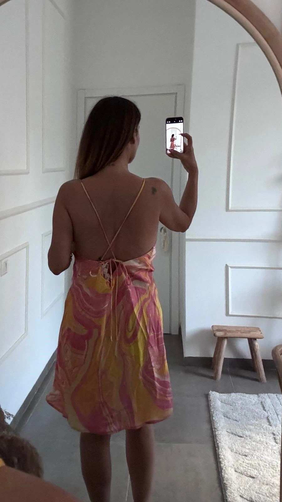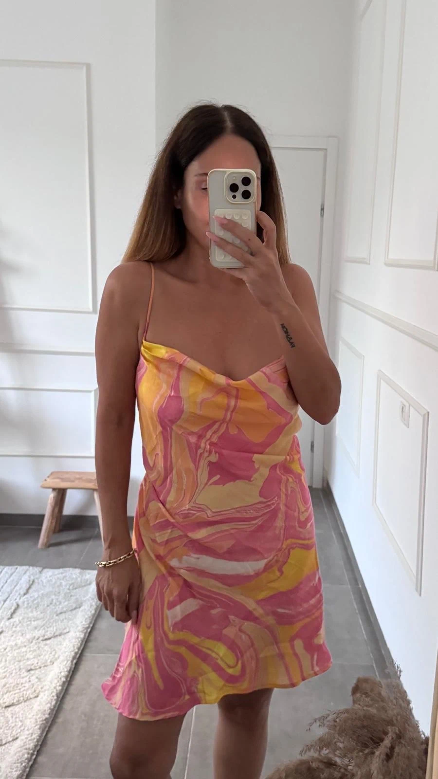 שמלה של מנגו מבד דמוי סאטן עם הדפס צבעוני