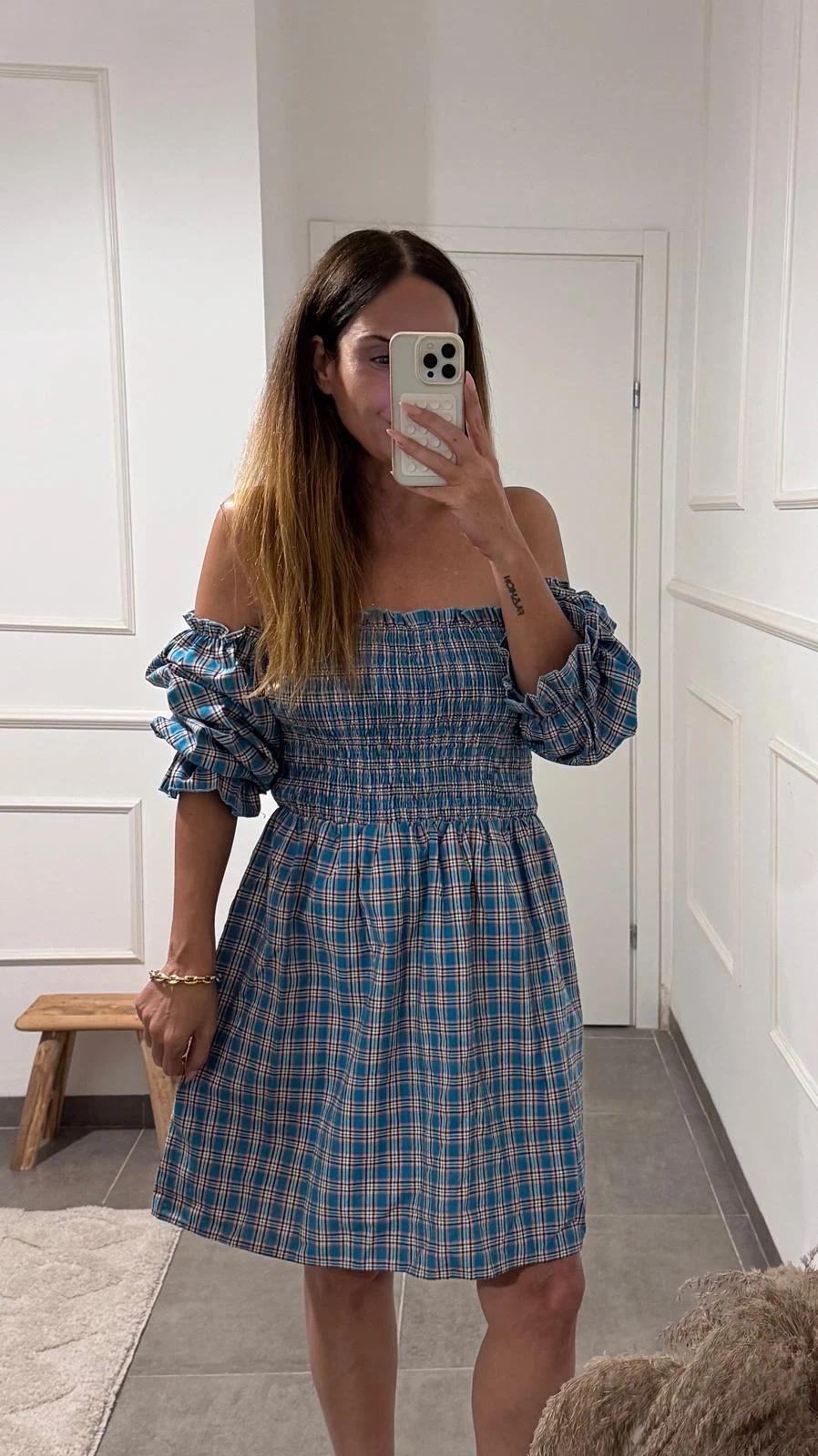 שמלת משובצת עם שרוולים נפוחים